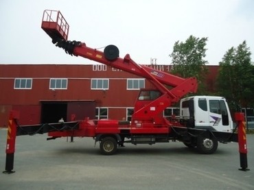 Данная автовышка способна добраться в положение до 21 м, и подвинуться вдаль от шасси на 12 м, подобные автовышки удобны по тематикам подъема рабочих для общетехнических и опиловочных задач, подачи и крепления стеклопакетов и т.д..